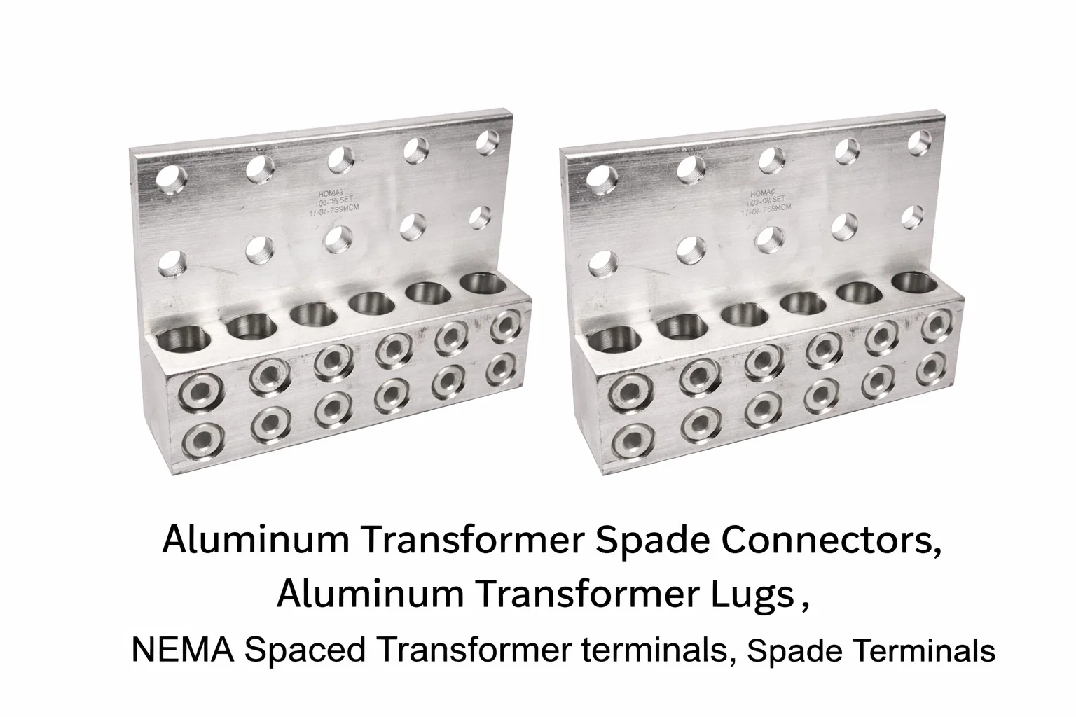 Aluminum Transformer Spade Connectors, Aluminum Transformer Lugs , NEMA Spaced Transformer terminals , Aluminum Spade Terminals, Aluminum Transformer Spades Premium Quality Electrical Connection Solutions for Power Distribution Systems Aluminum Transformer Connectors Rate: US$ 4.30/Kilogram, CIF USA sea port Aluminum Transformer Spade Connectors Aluminum transformer spade connectors are specialized electrical connectors designed to create secure, low-resistance