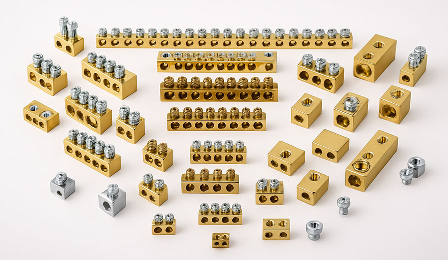 Precision-engineered brass neutral links and bar connectors for efficient power distribution in control panels.